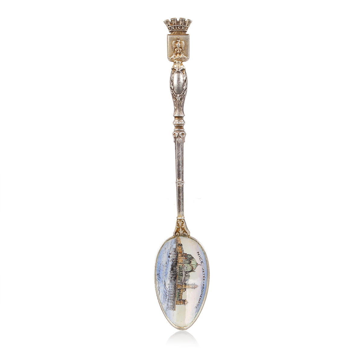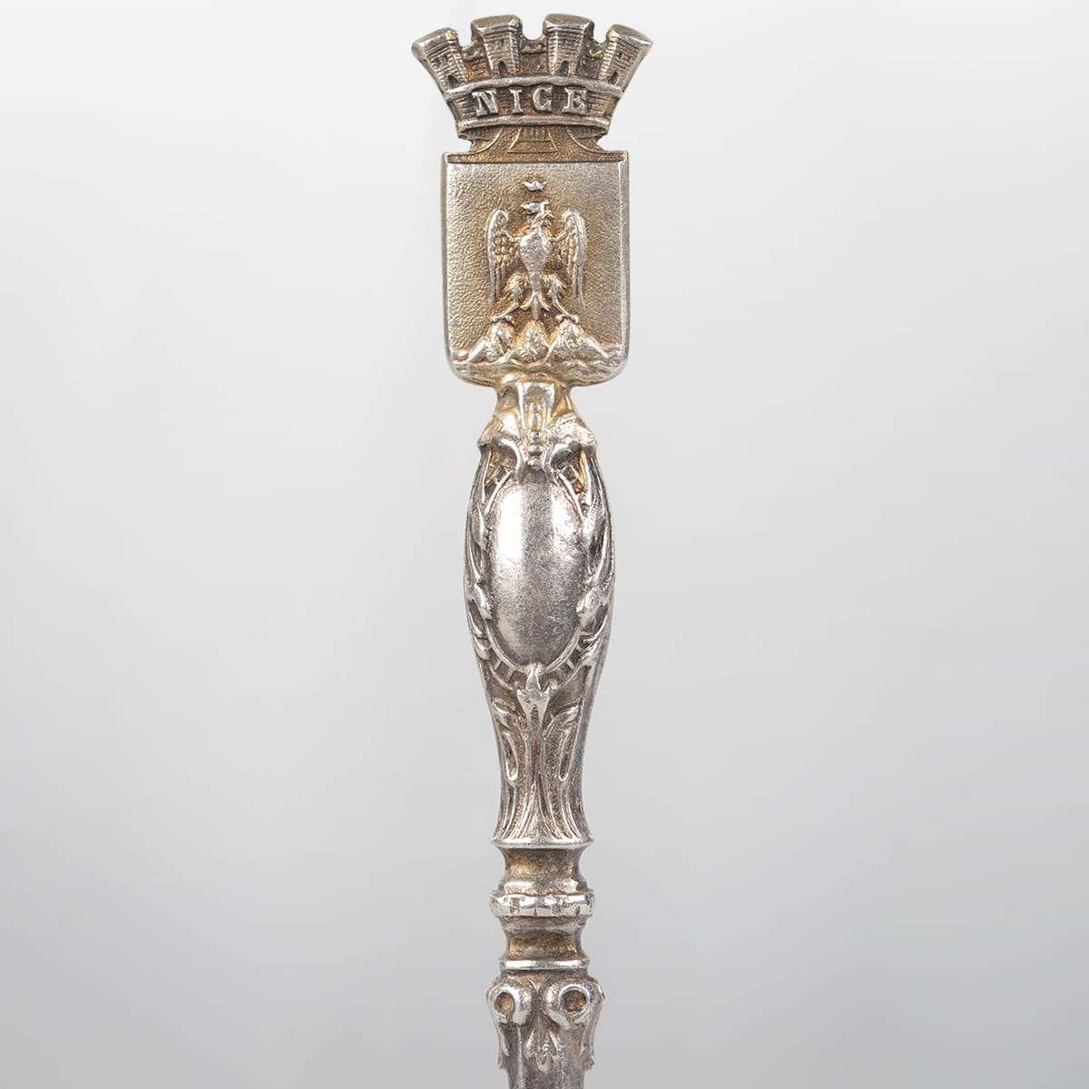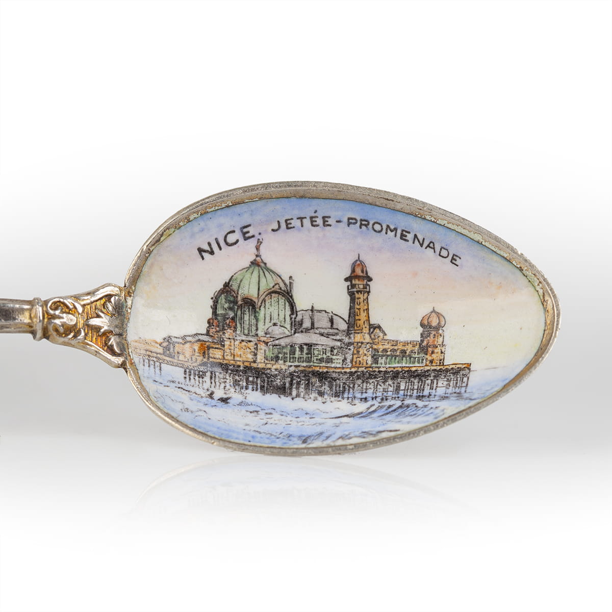 Łyżeczka będąca przykładem rzemiosła artystycznego najwyższej klasy - łączącego w sobie kunszt złotnictwa oraz emalierstwa. Czerpak zdobiony emalią z przedstawieniem nieistniejącego już budynku kasyna de la Jetée-Promenade na tle pomarańczowo- żółtego nieba, powyżej napis "NICE. JETEE- PROMENADE". Smukły ośmiokątny trzonek bogato dekorowany z antyczną głową umieszoną na odwrocie czerpaka. Górna część trzonka w formie ozdobnej tralki, zakończonej herbem Nicei z orłem, nad nim korona z napisem "NICE". Na odwrocie próba srebra 800 z głową Minerwy z liczbą "2" poniżej brody oraz romboidalna punca francuskiego złotnika "JM" prawdopodobnie należąca do Jeana Moucheronta.