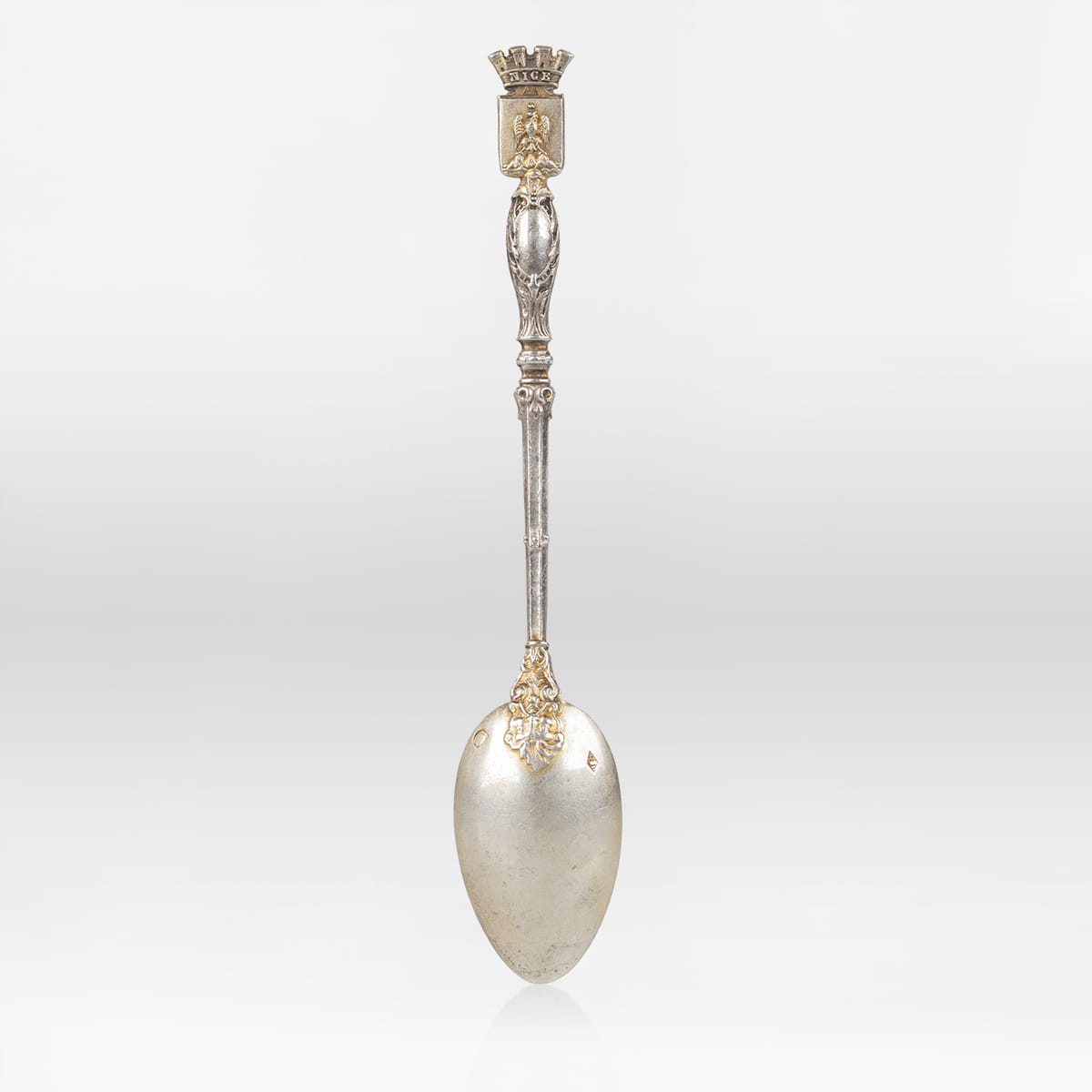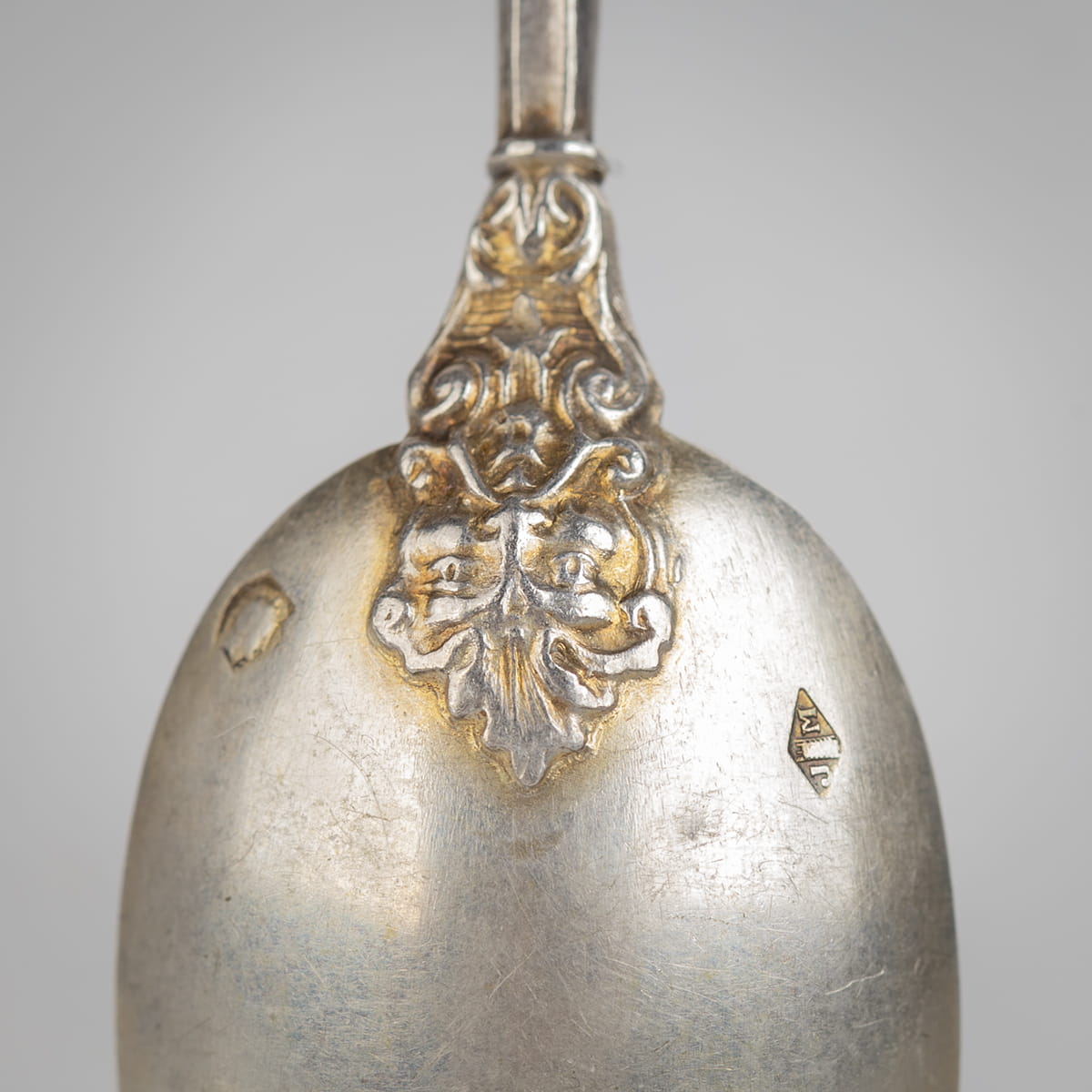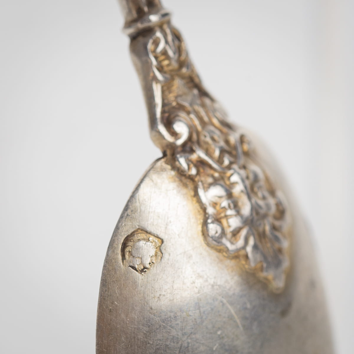 Łyżeczka będąca przykładem rzemiosła artystycznego najwyższej klasy - łączącego w sobie kunszt złotnictwa oraz emalierstwa. Czerpak zdobiony emalią z przedstawieniem nieistniejącego już budynku kasyna de la Jetée-Promenade na tle pomarańczowo- żółtego nieba, powyżej napis "NICE. JETEE- PROMENADE". Smukły ośmiokątny trzonek bogato dekorowany z antyczną głową umieszoną na odwrocie czerpaka. Górna część trzonka w formie ozdobnej tralki, zakończonej herbem Nicei z orłem, nad nim korona z napisem "NICE". Na odwrocie próba srebra 800 z głową Minerwy z liczbą "2" poniżej brody oraz romboidalna punca francuskiego złotnika "JM" prawdopodobnie należąca do Jeana Moucheronta.