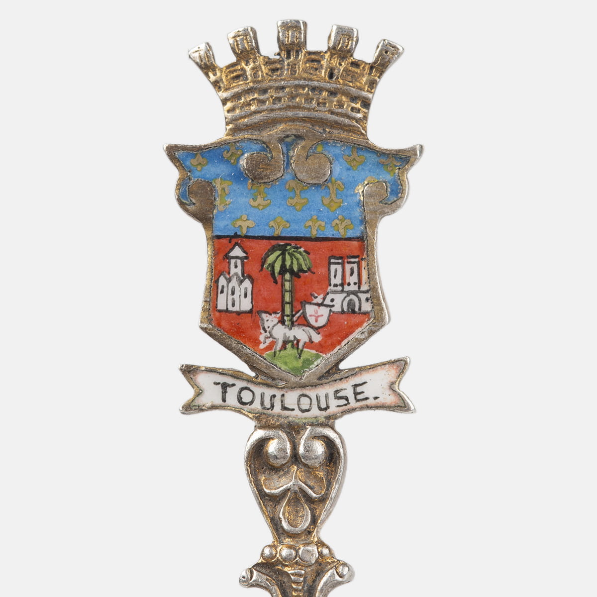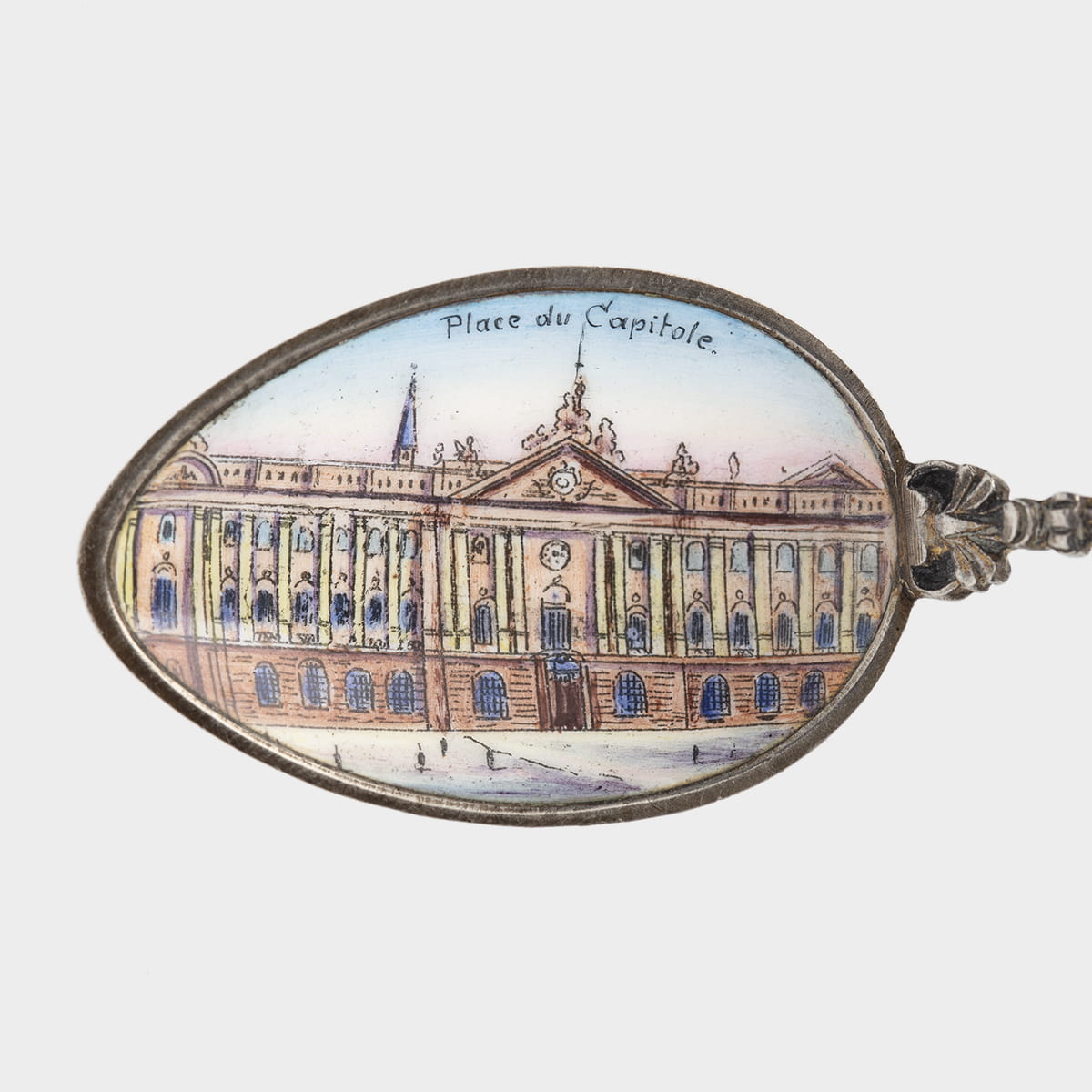 Łyżeczka będąca przykładem rzemiosła artystycznego najwyższej klasy - łączącego w sobie kunszt złotnictwa oraz emalierstwa. Czerpak zdobiony emalią z przedstawieniem Placu Kapitolińskiego w Tuluzie z budynkiem Kapitolu będącego siedzibą merostwa (dawna siedziba Kapituły Miejskiej) na tle błękitnego nieba. Żłobkowany trzonek z pojedynczymi ozdobnymi ornamentami, w zwieńczeniu emaliowany, barwny herb Tuluzy, nad nim korona. Na odwrocie próba srebra 800, punca pruska z półksiężycem i koroną (używana po 1886 roku) oraz napis "JMPORTE" i punca z monogramem złotnika.