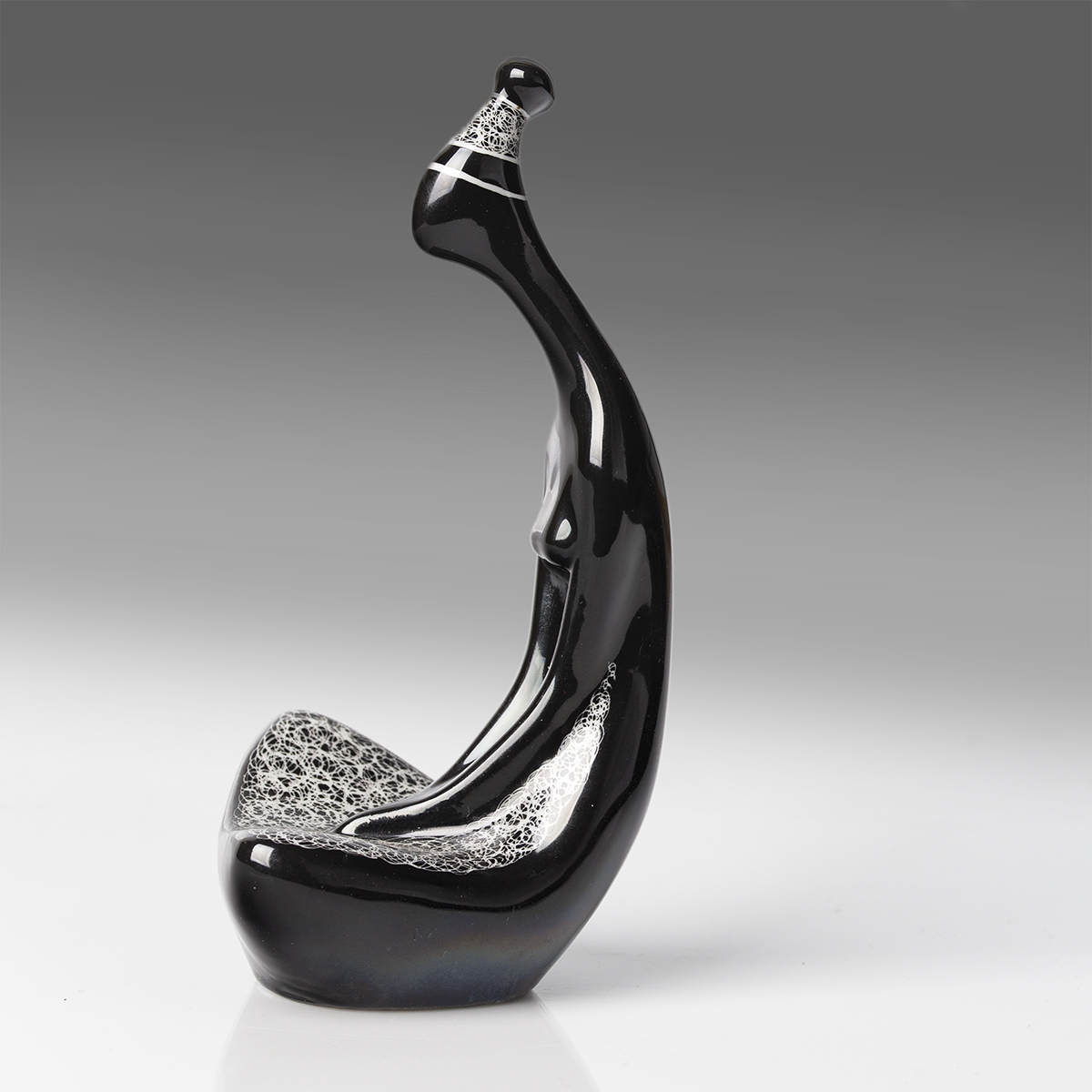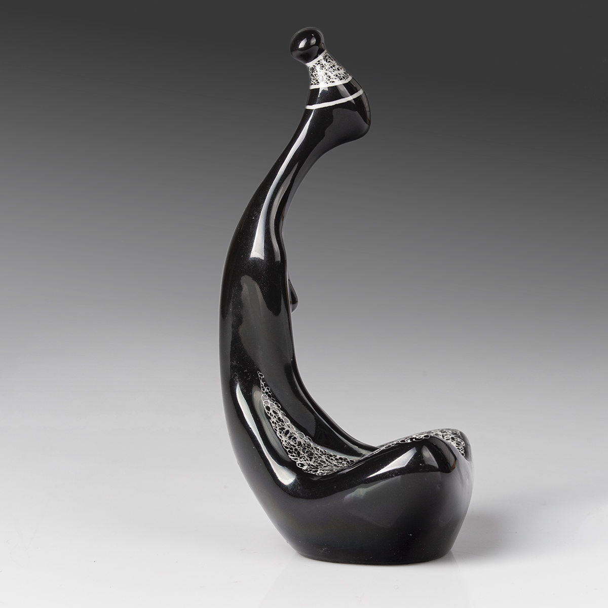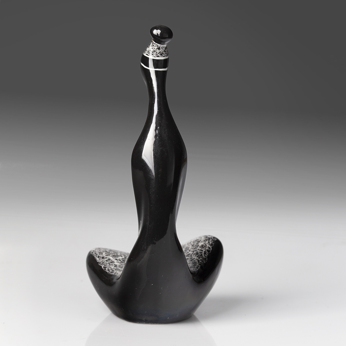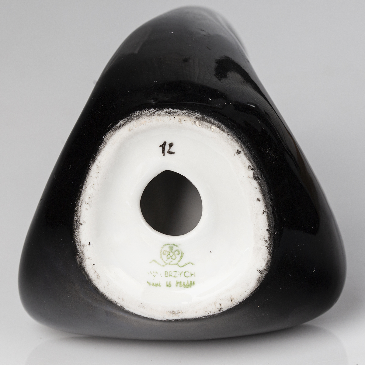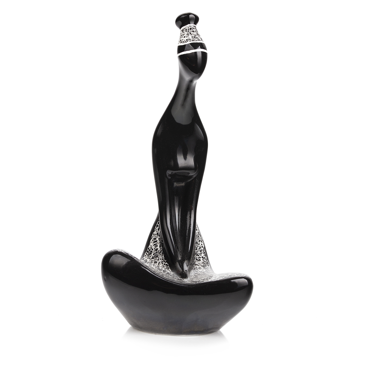 Porcelanowa figura przedstawiająca siedzącą kobietę - smukłą niewiastę siedzącą "po turecku" z dłońmi złożonymi przed sobą. Sudanka ma wysoko upięte włosy, długą, smukłą szyję. Postać wymalowana jest na czarno z minimalistyczną dekoracją uzyskaną poprzez wydrapywanie farby. Na spodzie zielony stempel z literą "W" w okręgu i napisem: "WAŁBRZYCH | MADE IN POLAND" oraz ręcznie zapisanym numerem malatury: "12". Całość tworzy niezwykle efektowny i nowoczesny przykład najlepszego polskiego wzornictwa!
