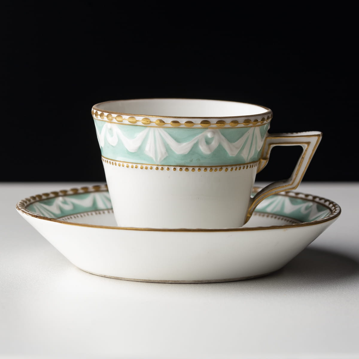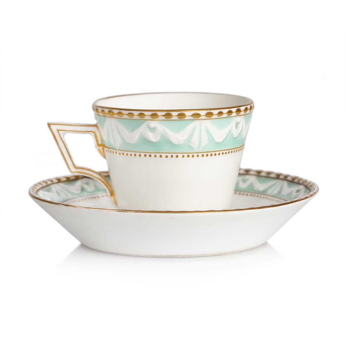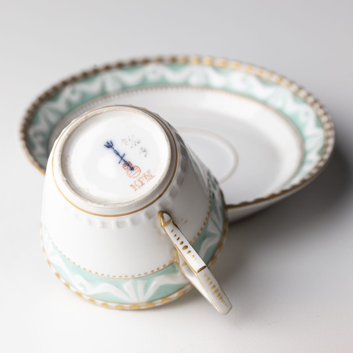 Porcelanowa filiżanka do mokki ze spodkiem wykonana w berlińskiej, Królewskiej Manufakturze Porcelany. Wszystkie elementy ręcznie malowane, zdobione opaską z ornamentem festonowym na turkusowym tle - wzór ten, zwany kurlandzkim został po raz pierwszy zastosowany przez manufakturę berlińską na początku lat 90. XVIII wieku na serwisie zamówionym przez księcia Kurlandzkiego. Serwis "kurlandzki" jest uznawany za najlepszą realizację klasycystyczną Berlina; dekoracja kwiatowa powtarza motyw popularny na przełomie XVIII i XIX wieku. Ucho filiżanki w romboidalnej, geometrycznej formie. Wszystkie elementy sygnowane u dołu znakiem w formie jabłka królewskiego z krzyżem i inicjałami KPM (w kolorze ceglastym - taka sygnatura była używana przez manufakturę od 1832 roku do 1913 roku) oraz kobaltowym berłem stosowanym po 1870 roku.