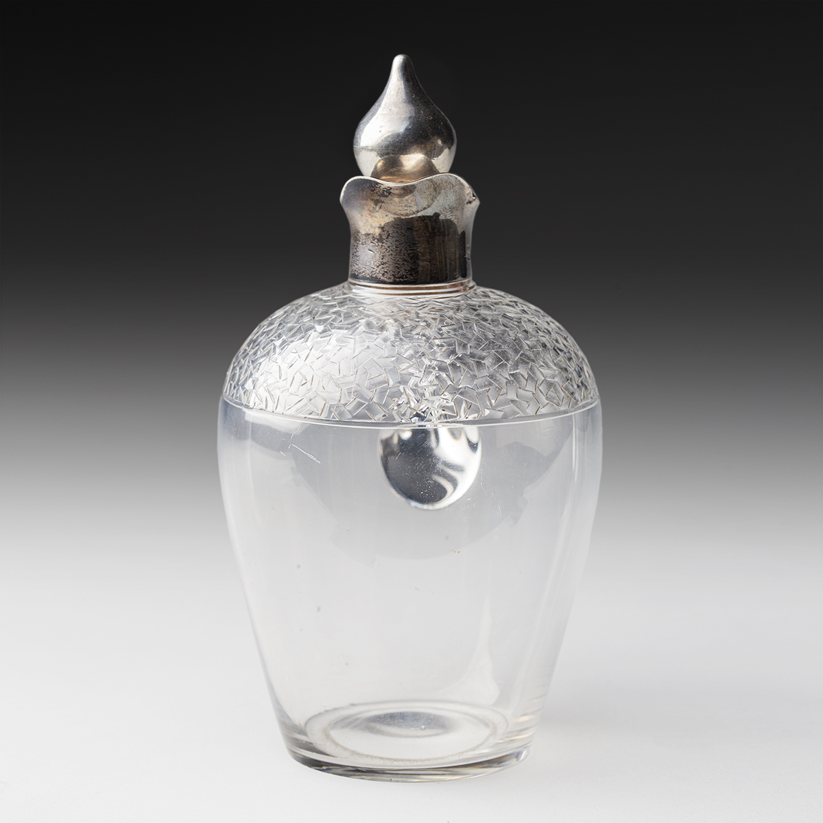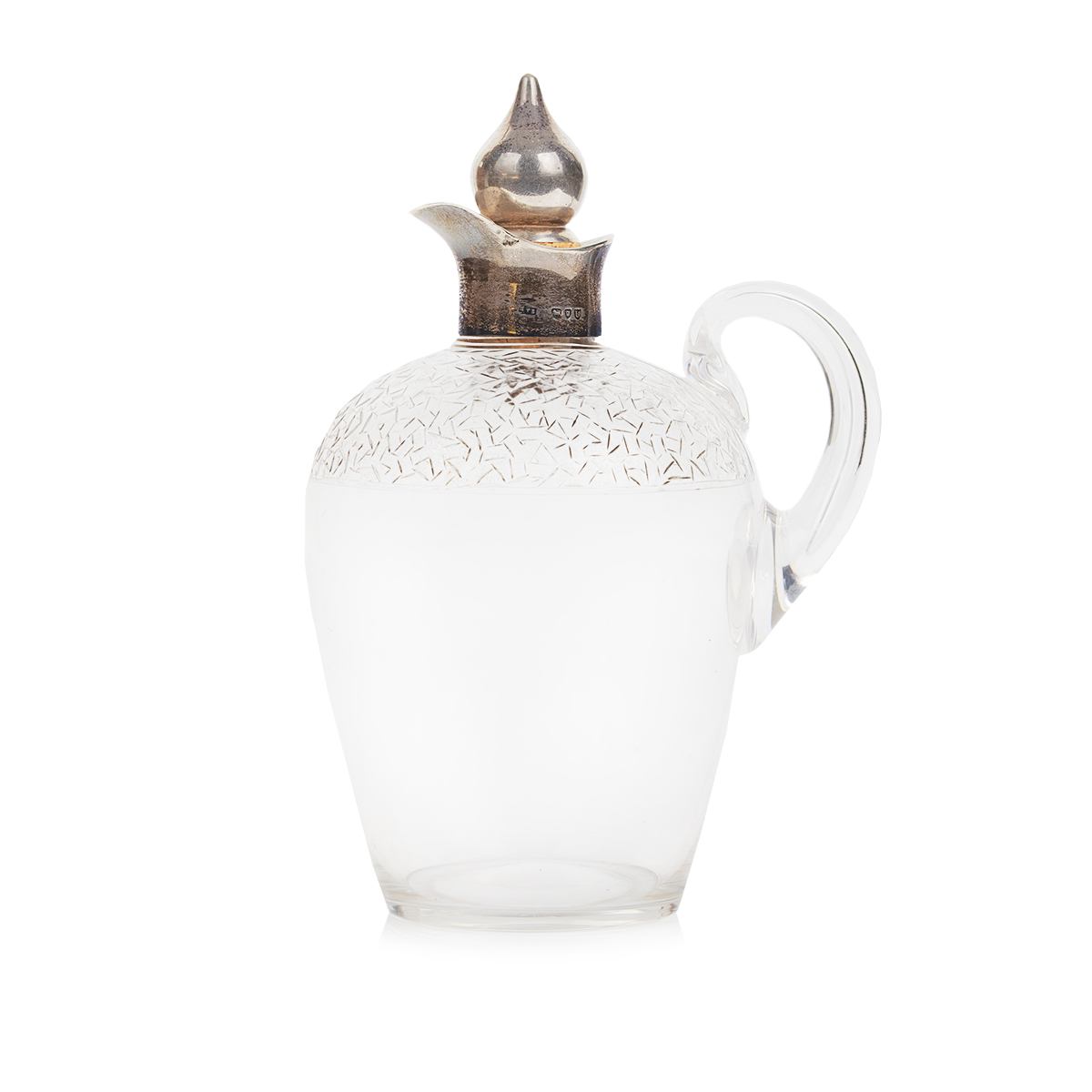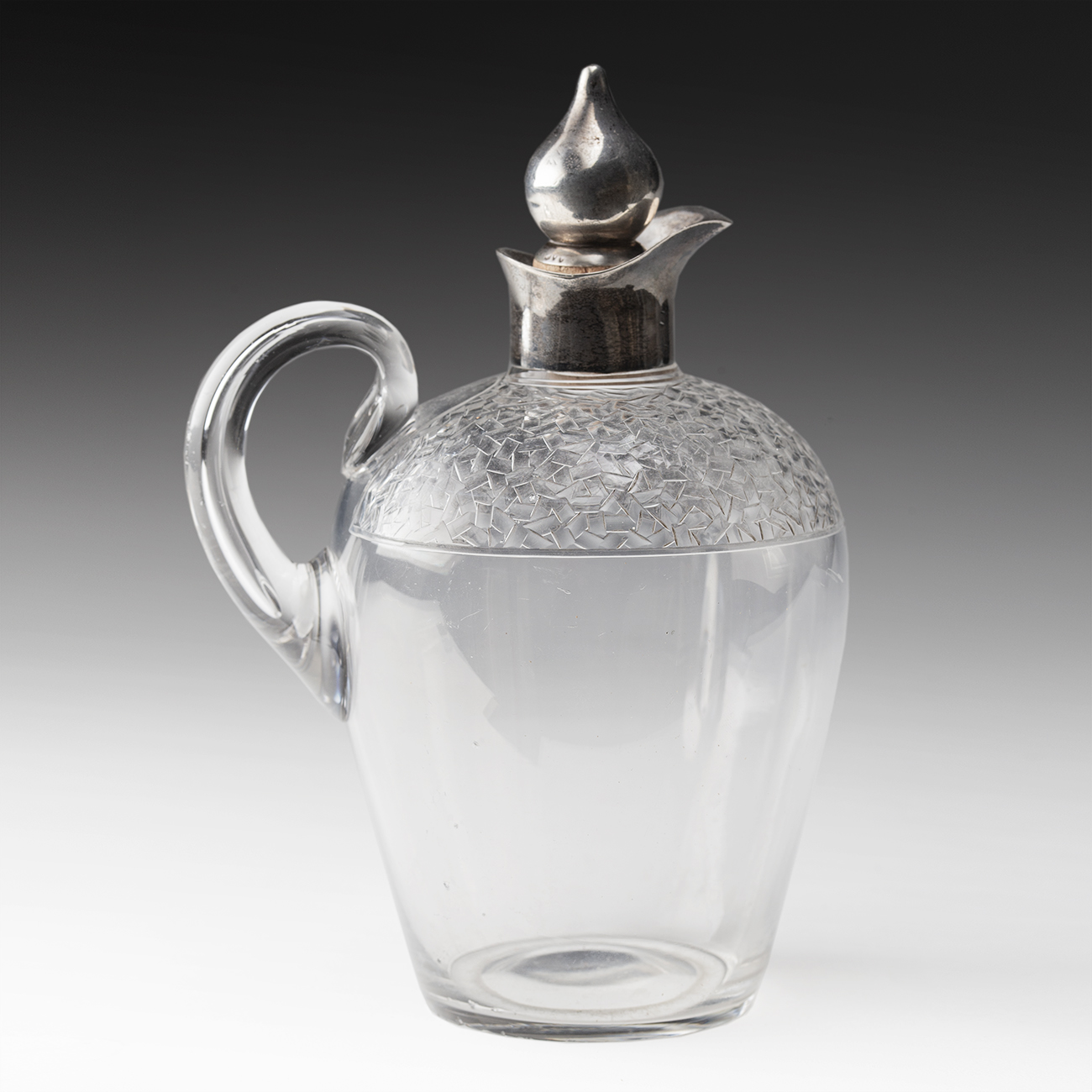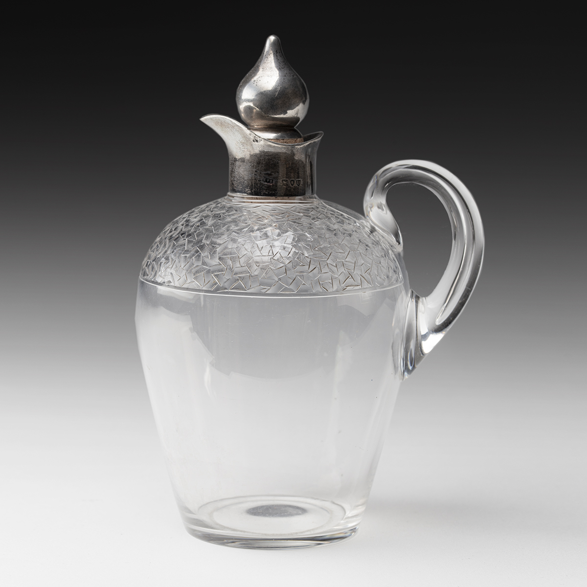 Wyjątkowa i niezwykle efektowna karafka mogąca służyć do serwowania zarówno wina jak i mocnych alkoholi. Wykonana z ręcznie szlifowanego szkła ołowiowego, z okuciem ze srebra próby 925 (sterling). Na okrągłej podstawie osadzony jest pękaty brzusiec z gładkiego, przejrzystego szkła, w górnej partii karafki niezwykle kunsztowny i misterny geometryczny szlif w formie drobnej, nieregularnej mozaiki. Srebrne okucie wlewu z łagodnie wygiętym dzióbkiem zwieńczone korkiem zakończonym gruszkowatym kształtem. Całość uzupełnia szklany uchwyt o miękkiej linii, harmonijnie połączony z brzuścem. Na srebrnym okuciu i zwieńczeniu korka próby srebra z lewem, lwią głową i literą "U" oraz oznaczeniem angielskiego złotnika.