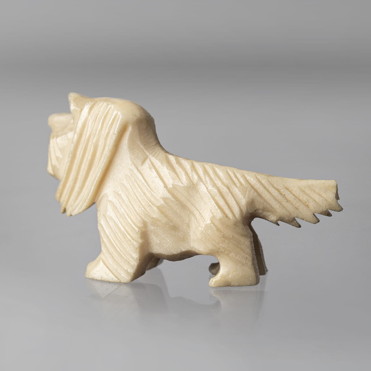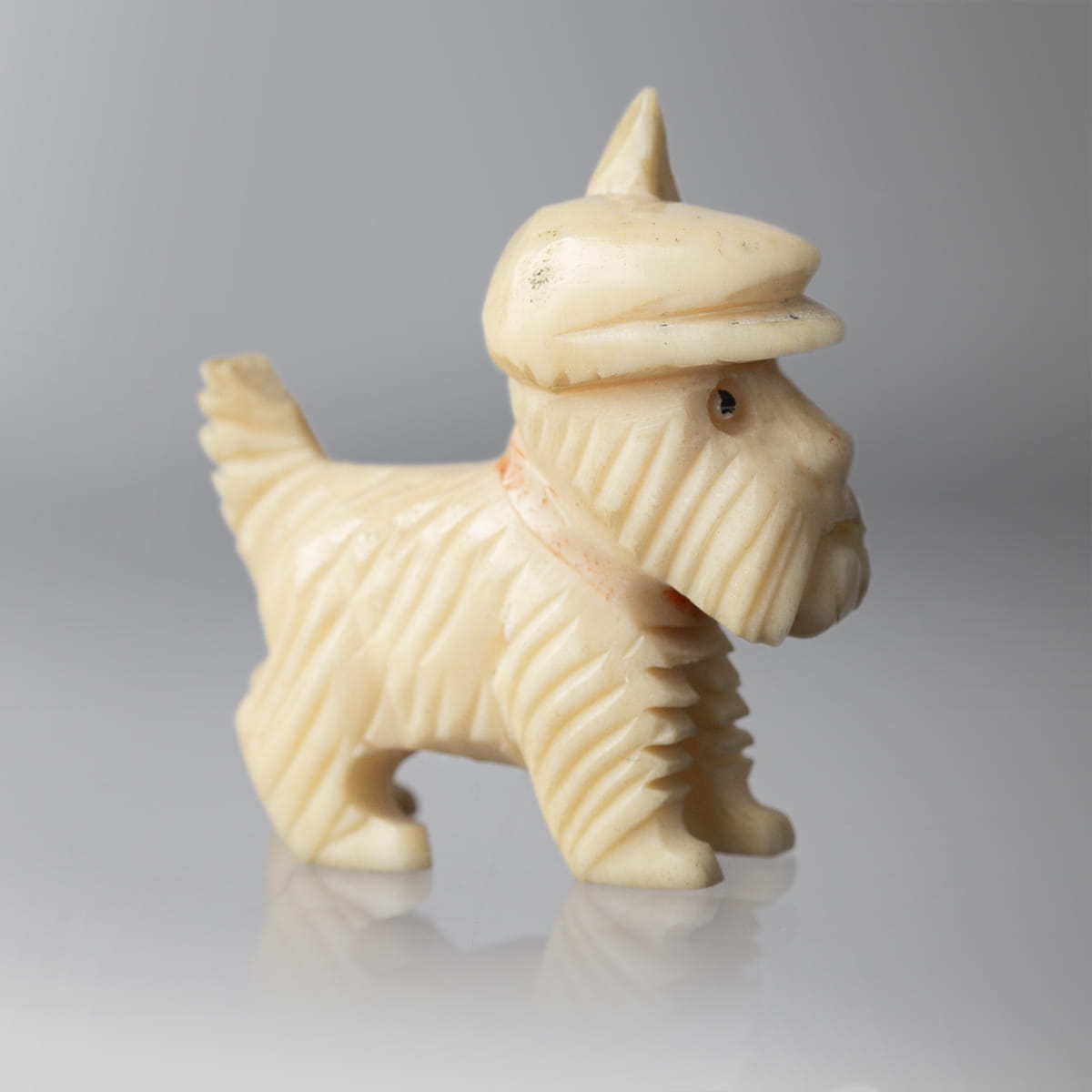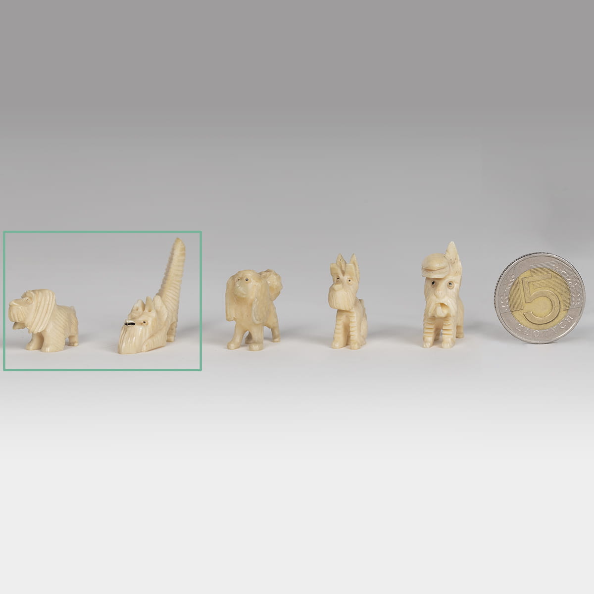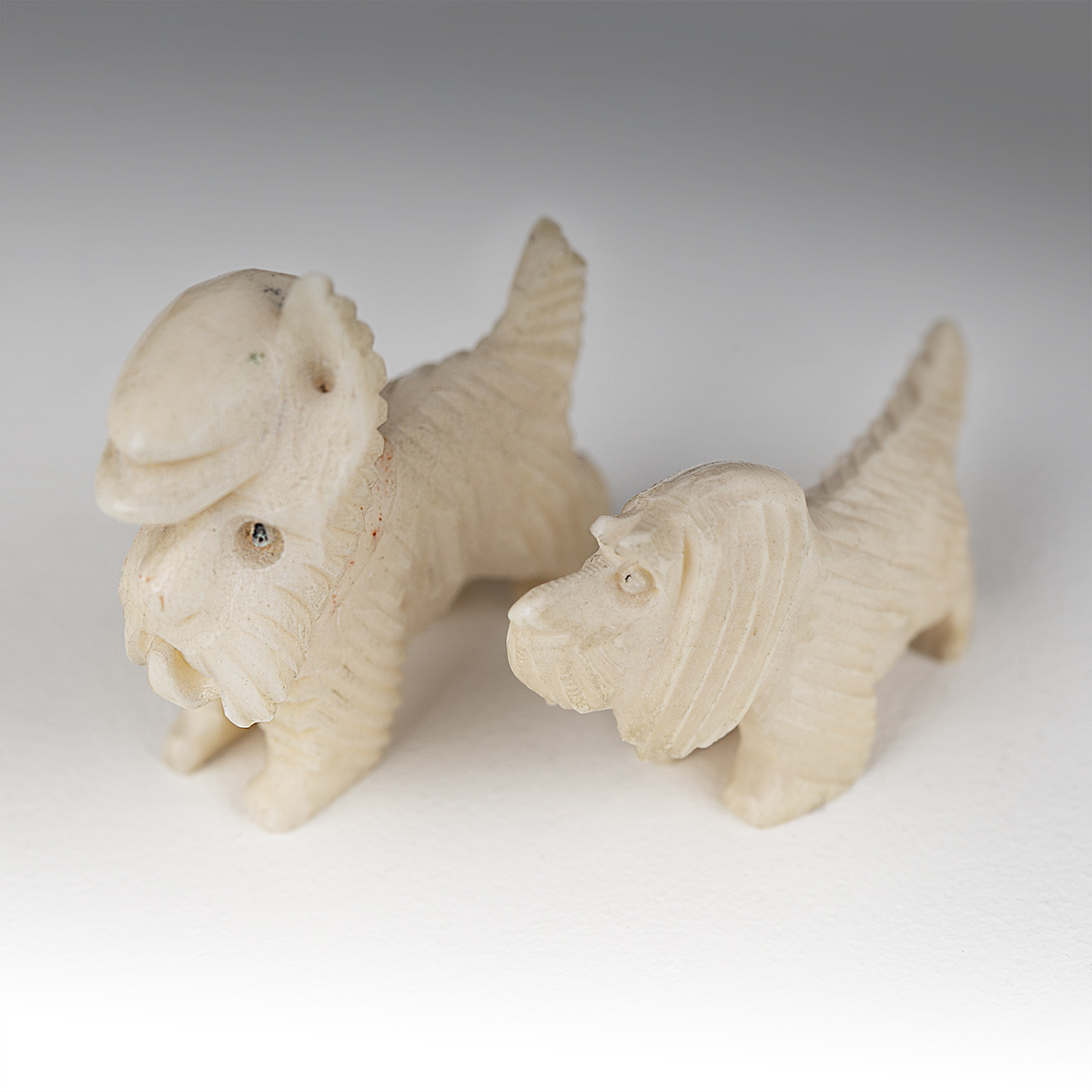 Miniaturowe rzeźby dwóch psów wykonane w całości z kości. Jeden z nich to basset, stojący na czterech łapach z dużymi, długimi, zwisającymi uszami oraz wyprostowanym ogonem. Druga z figurek to terrier stojący na czterech łapach z charakterystycznymi dla rasy dłuższymi włosami na pyszczku, przedstawiony został w kaszkiecie założonym na jedno ucho.