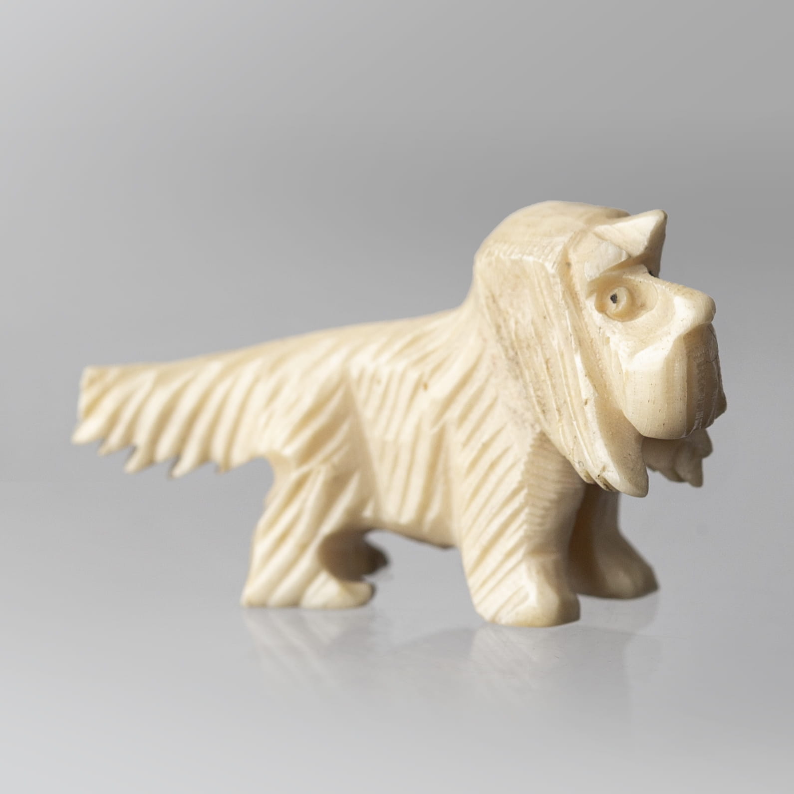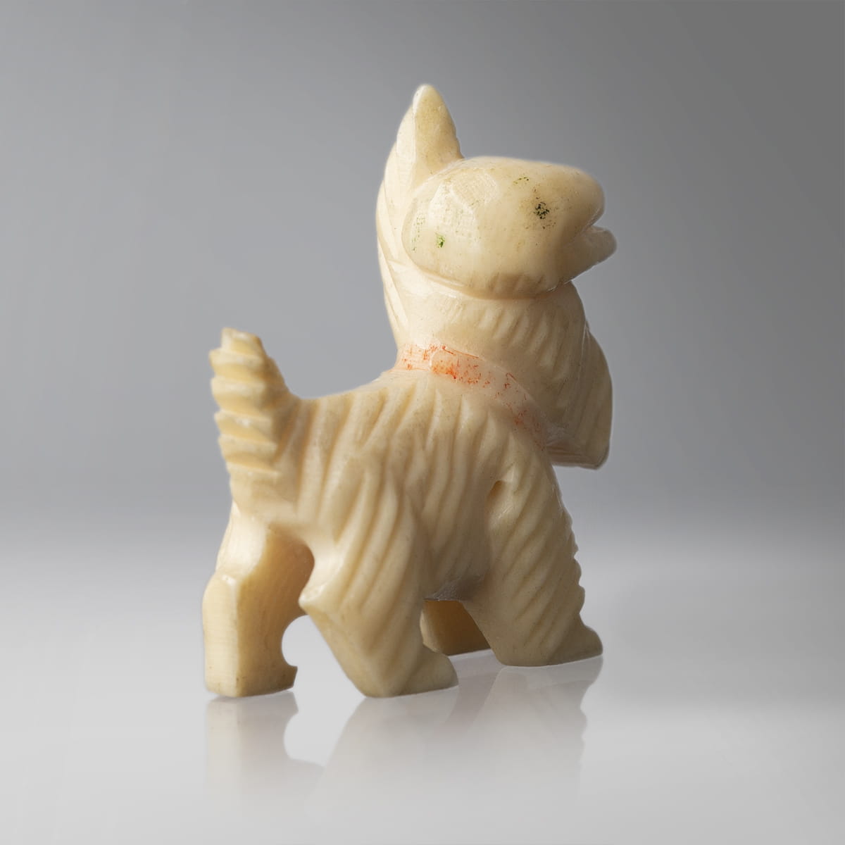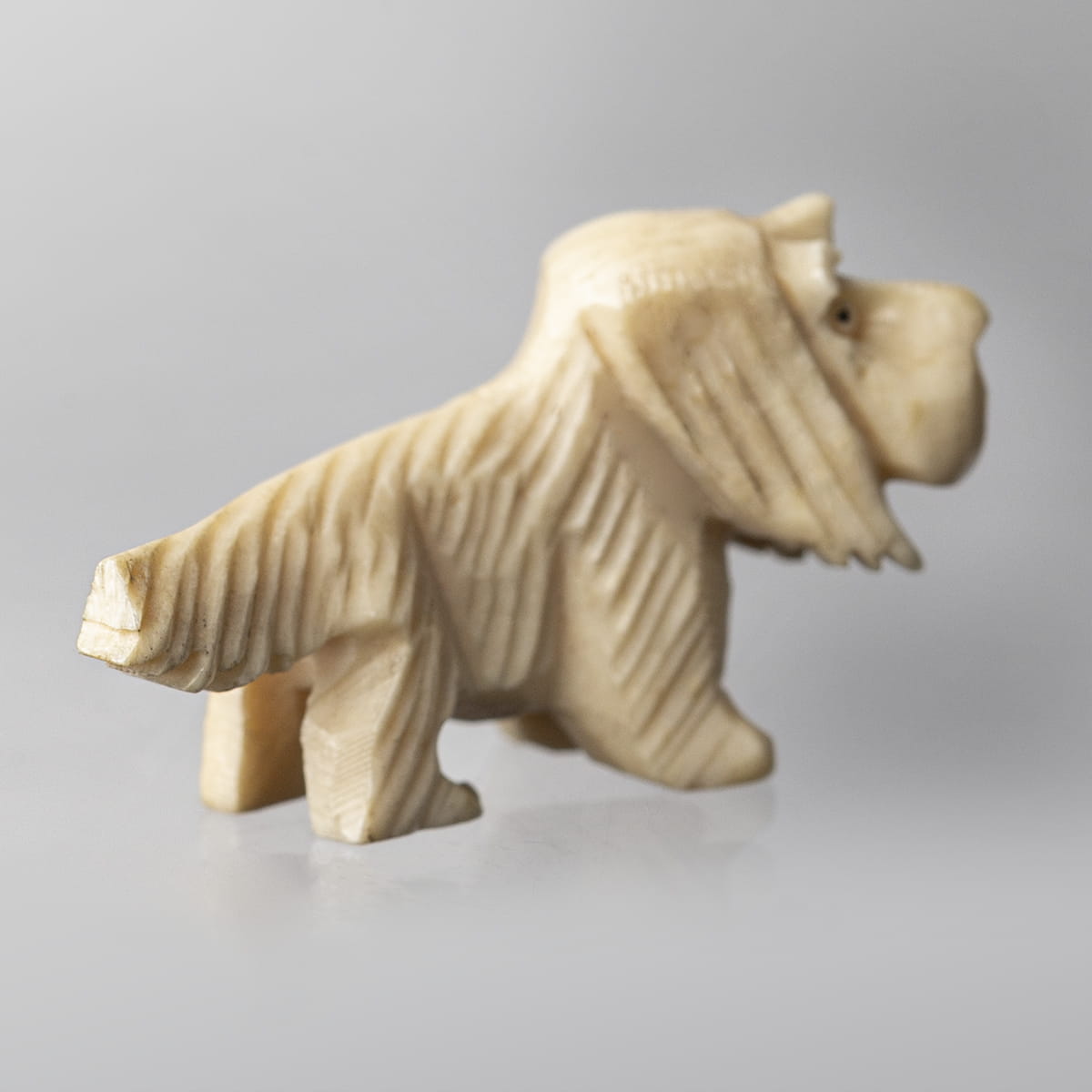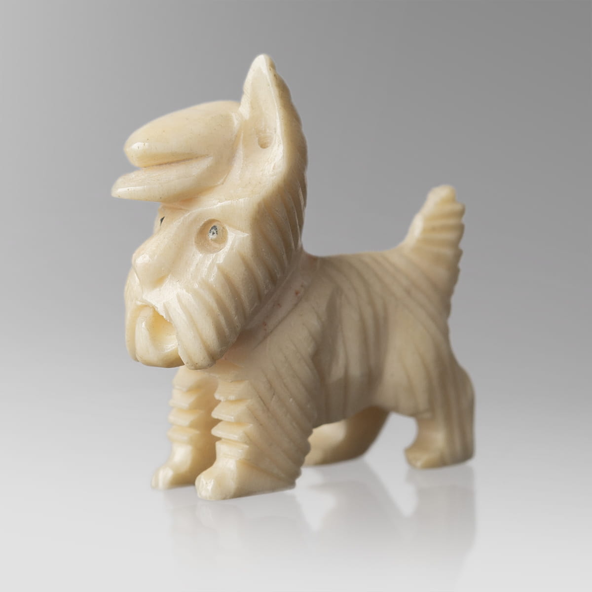 Miniaturowe rzeźby dwóch psów wykonane w całości z kości. Jeden z nich to basset, stojący na czterech łapach z dużymi, długimi, zwisającymi uszami oraz wyprostowanym ogonem. Druga z figurek to terrier stojący na czterech łapach z charakterystycznymi dla rasy dłuższymi włosami na pyszczku, przedstawiony został w kaszkiecie założonym na jedno ucho.