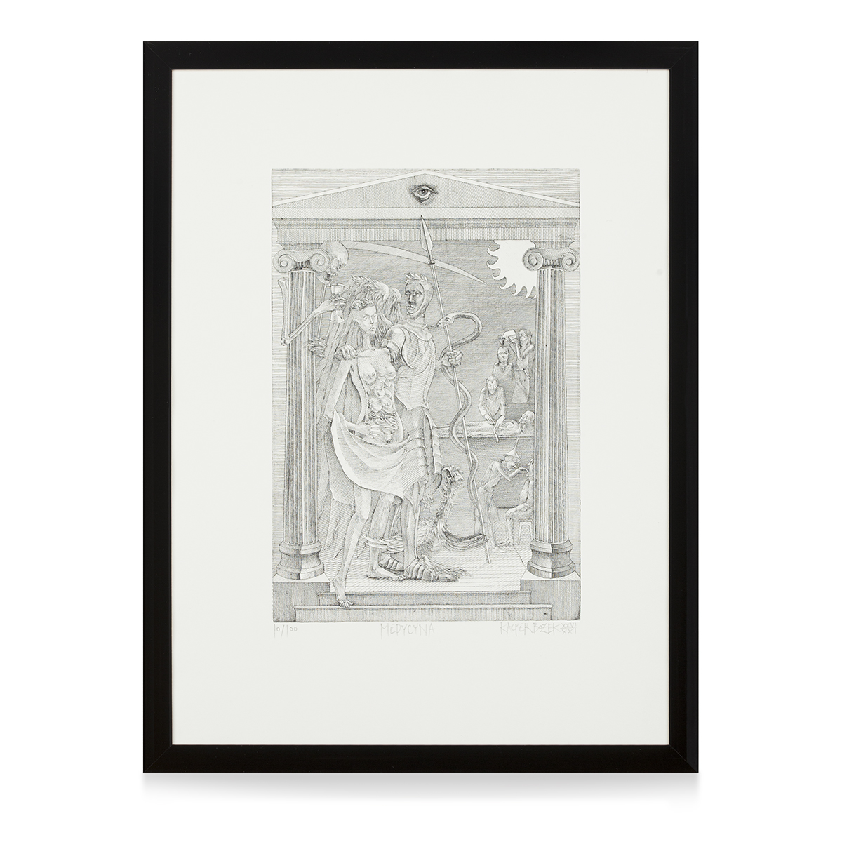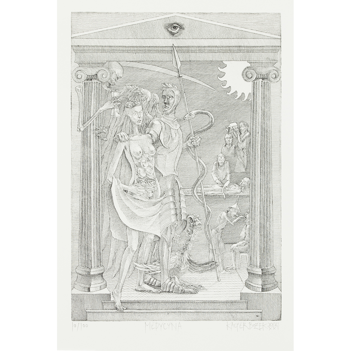 Grafika jednego z najzdolniejszych współczesnych grafików warsztatowych, wykładowcy krakowskiej ASP - Kacpra Bożka, przedstawiająca medyczną kompozycję alegoryczną. W pionowej kompozycji artysta ukazał scenę rozgrywającą się we wnętrzu przypominającym antyczną świątynię - przestrzeń została zamknięta między dwiema kolumnami podtrzymującymi trójkątny fronton, w którego centrum widoczne jest "Oko Opatrzności", znane też jako „wszystkowidzące oko”. Na pierwszym planie widoczne są trzy postacie – kobieta uosabiająca postać wymagającą interwencji medycznej, dzielny rycerz będący personifikacją medycyny (trzymający włócznię wokół której owija się eskukap) oraz kościotrup trzymający w ręce klepsydrę. W głębi kompozycji, na dalszych planach widoczne są postacie wykonujące zabiegi medyczne (m.in. wlewanie oleju do głowy i wycinanie ślepej kiszki).