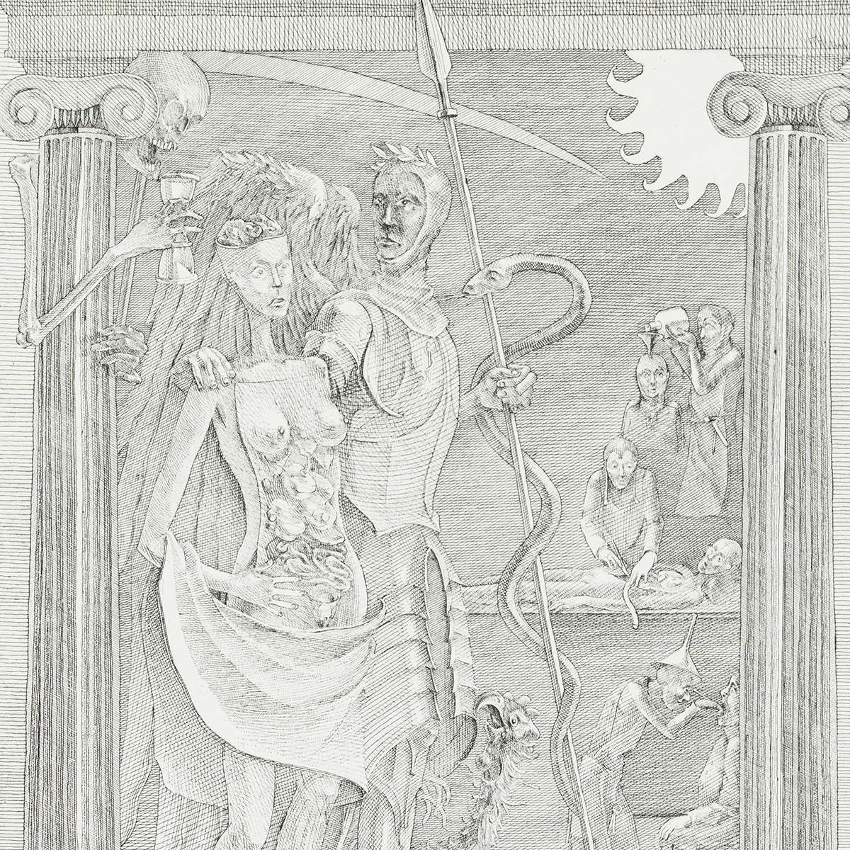 Całość wykonana jest niezwykle precyzyjnie z dbałością o najmniejsze detale, co jest charakterystyczne dla całej twórczości graficznej Kacpra Bożka.