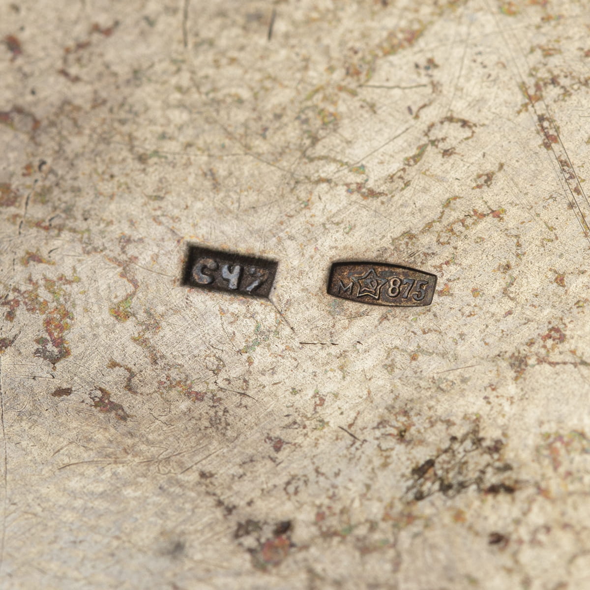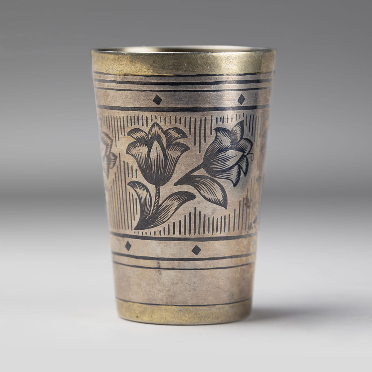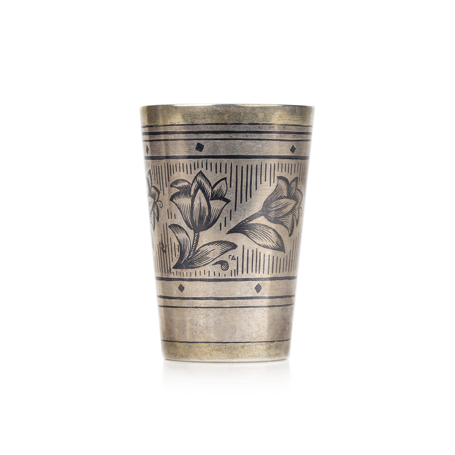 Kieliszek wykonany w całości ze srebra próby 875, brzusiec zdobiony techniką niello z motywem tulipanów. Na spodzie kieliszka umieszczona próba srebra 875 wraz z oznaczeniem na rynek rosyjski (młot i sierp w pięcioramiennej gwieździe) oraz sygnatura wytwórni. Całość stanowi przykład wyjątkowej jakości rzemiosła i zdobnictwa, a przedmioty wykonane przez Severnaya Chern, doceniane były międzynarodowo jako przykłady mistrzostwa rzemieślniczego i unikalnego dziedzictwa kulturowego Rosji.
