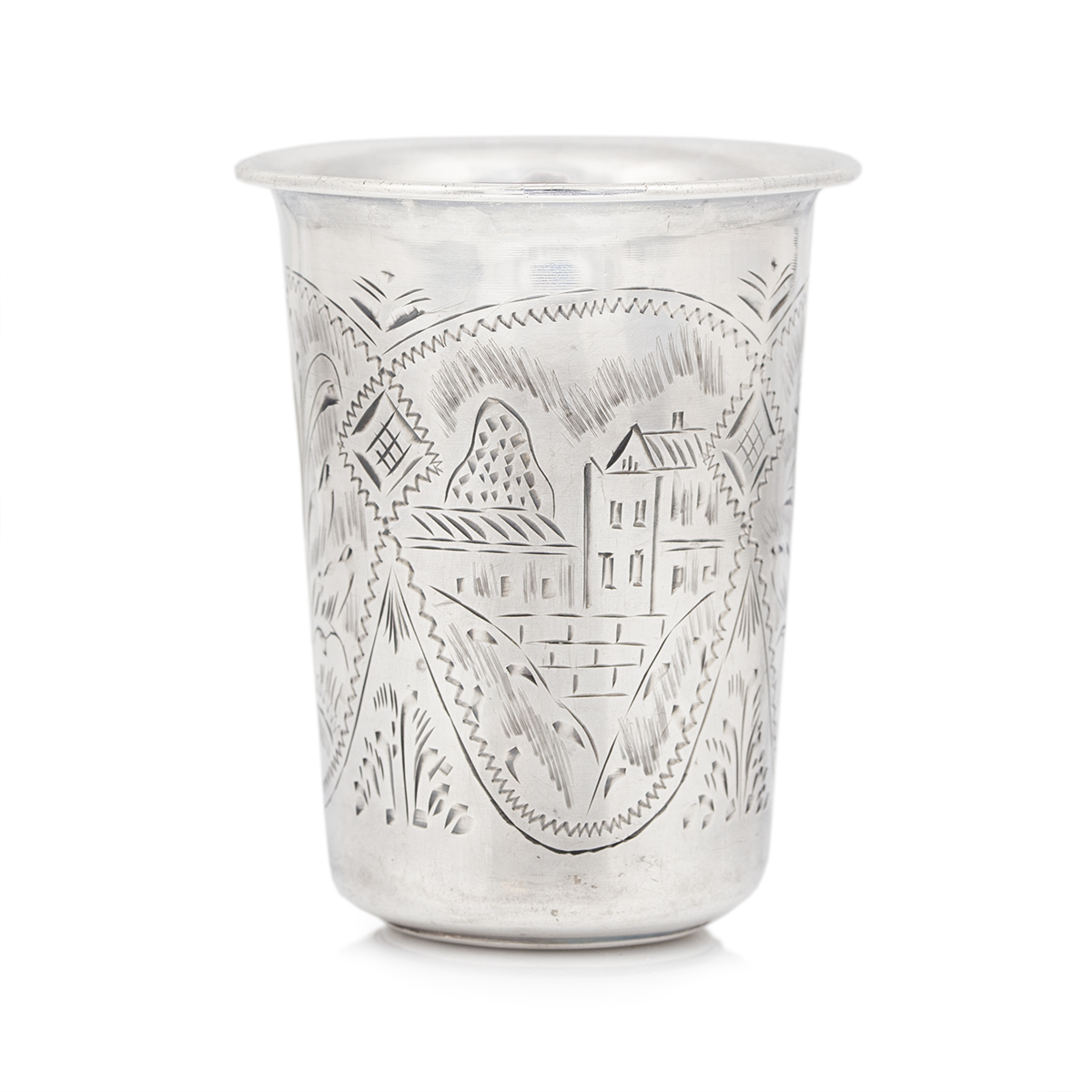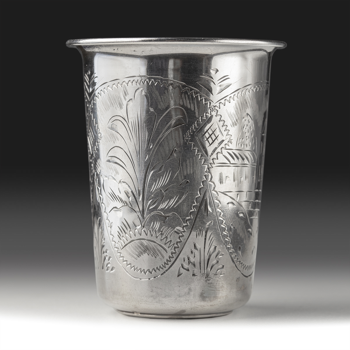 Kubek wykonany w całości ze srebra próby 84, brzusiec zdobiony naprzemiennie polami grawerowanymi motywem architektonicznym oraz ornamentem roślinnym. Na spodzie umieszczona próba srebra 84 wraz z imiennikiem probierza Anatolija Apollonowicza Artsybasheva z datą 1889 oraz punca miejska Moskwy ze świętym Jerzym, obok imiennik złotnika Romana Arystarchowa (czynnego w latach 1880-1896).