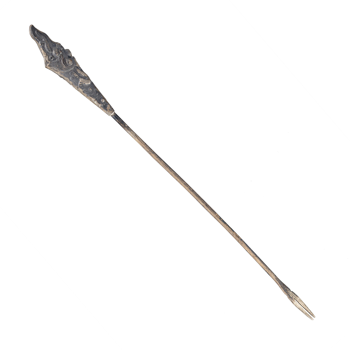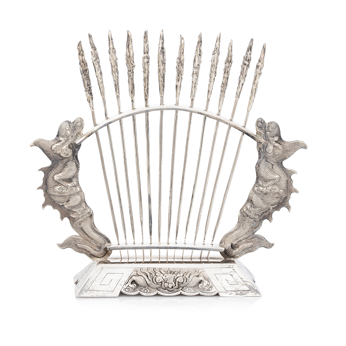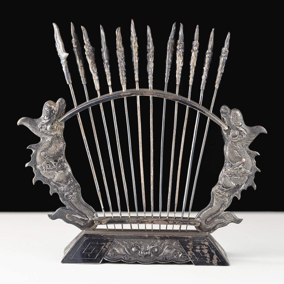 Zestaw 12 szpikulców / szpadek do przystawek i koreczków umieszczonych na stojaku o prostokątnej podstawie. Boki stojaka ozdobione uchwytami w formie mitycznych zwierząt Kỳ lân (pojawienie się Kỳ lân uważane było za dobry znak, symbol łaski niebios. Kỳ lân ukazywał się bowiem tylko tam, gdzie ludzie żyli uczciwie i panowała harmonia). Wszystkie elementy wykonane w całości ze srebra próby 875 (każdy element ocechowany polską próbą srebra "2" używaną w latach 1963-1986, dodatkowo na podstawie próba wietnamska). Obiekt ten może dodać orientalnego urozmaicenia na każdym stole.